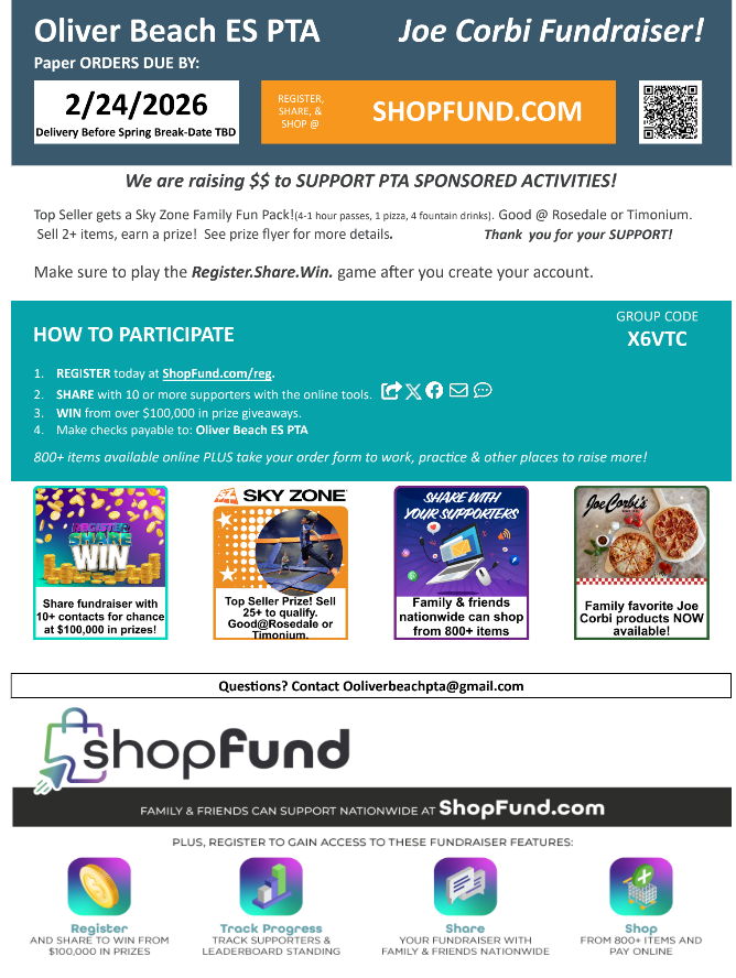 Check out this year's fundraiser! Some new items to check out! Register your child online to give them the opportunity to spin the wheel for chances to win cool prizes! Any questions can be sent to our email, Oliverbeachpta@gmail.com.